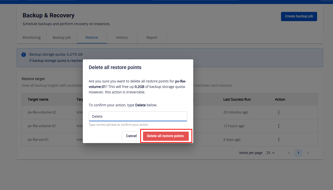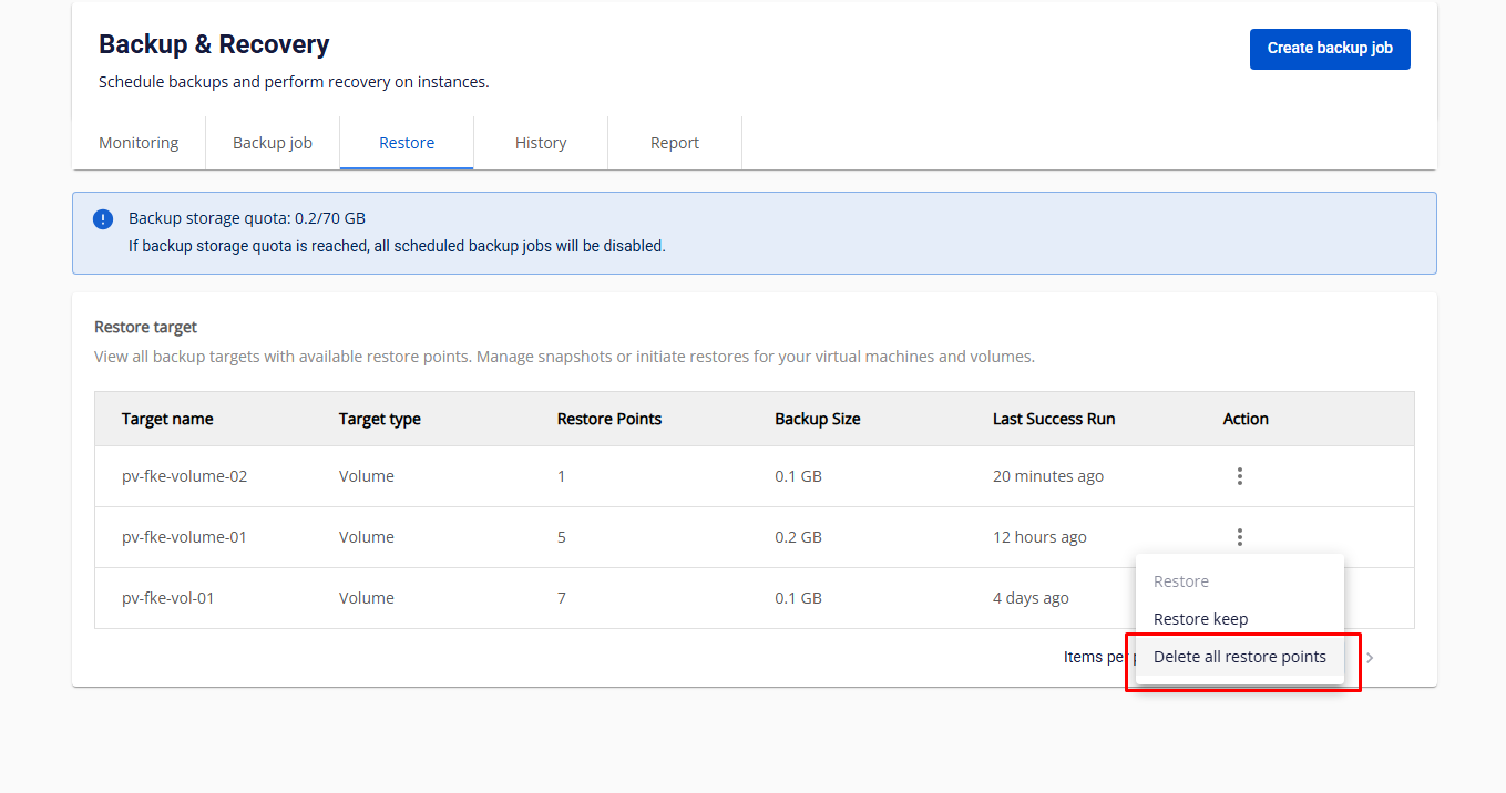 Để thực hiện xóa các restore points nhằm tiết kiệm dung lượng lưu trữ và dọn dẹp các bản sao lưu không còn cần thiết, quý khách hàng có thể thực hiện thao tác xóa toàn bộ restore points của một target. Quy trình dưới đây hướng dẫn chi tiết các bước cần thiết để đảm bảo việc xóa được thực hiện đúng mục tiêu và an toàn.