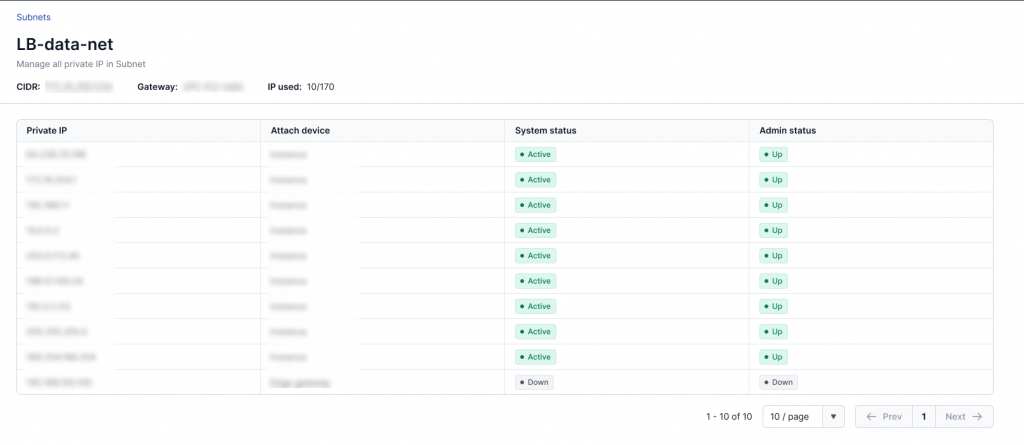 Bước 1: Ở meu chọn Subnet, chọn vào chi tiết của một Subnet. Người dùng chọn một địa chỉ private IP đang có Admin State là Up > chọn Actions