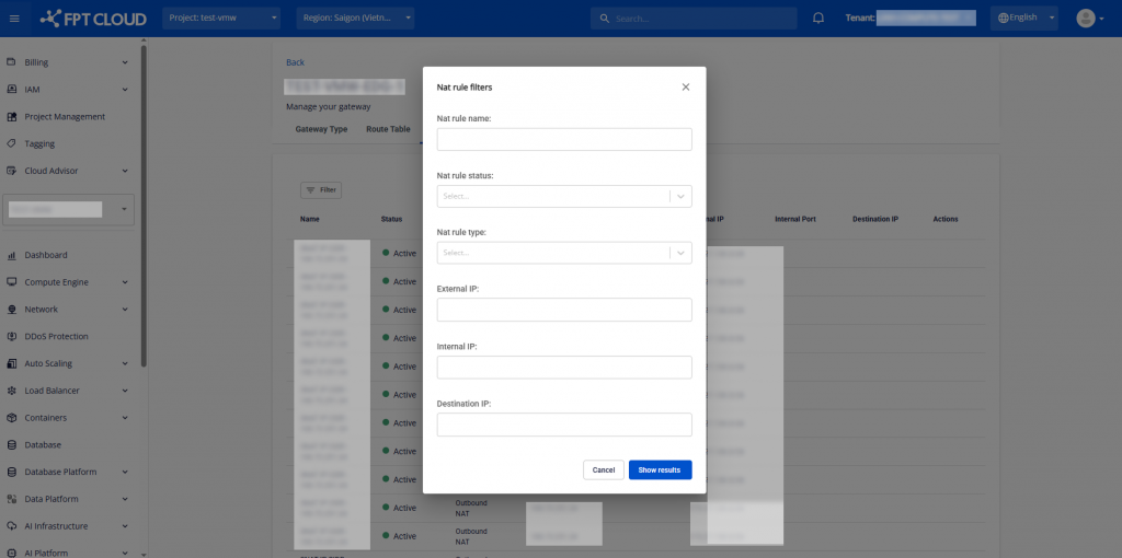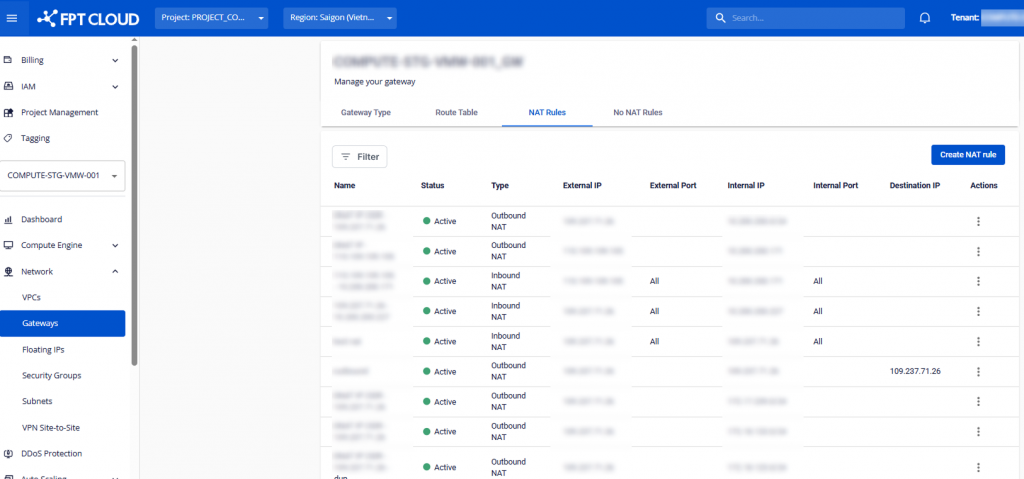 | Internal IP | Lọc NAT rule theo IP nội bộ (Internal IP) của instance. Nhập IP private trong VPC. Hỗ trợ IPv4. Ví dụ: nhập 10.10.5.21 để xem rule NAT của Instance này. |