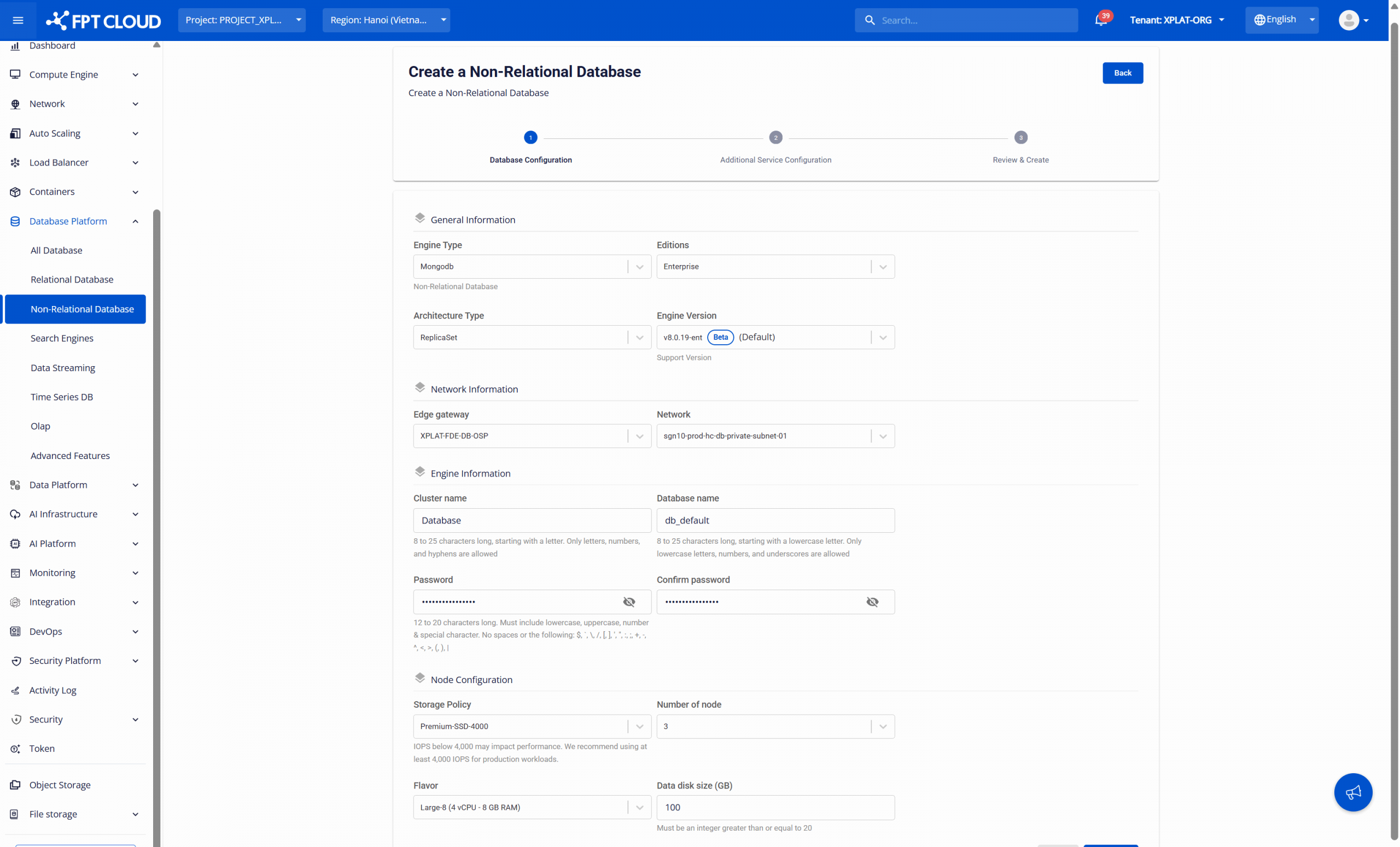 Truy cập trang danh sách cơ sở dữ liệu Non-Relational Database (chi tiết xem mục Xem danh sách cụm cơ sở dữ liệu, chọn Create a Database Engine hoặc Create để bắt đầu quá trình khởi tạo một cụm cơ sở dữ liệu mới. Màn hình Create New Database sẽ được mở, cho phép bạn cấu hình các thông số cần thiết để định nghĩa và triển khai cụm cơ sở dữ liệu trong môi trường FPT Database Engine. Tiến trình triển khai gồm 3 bước: