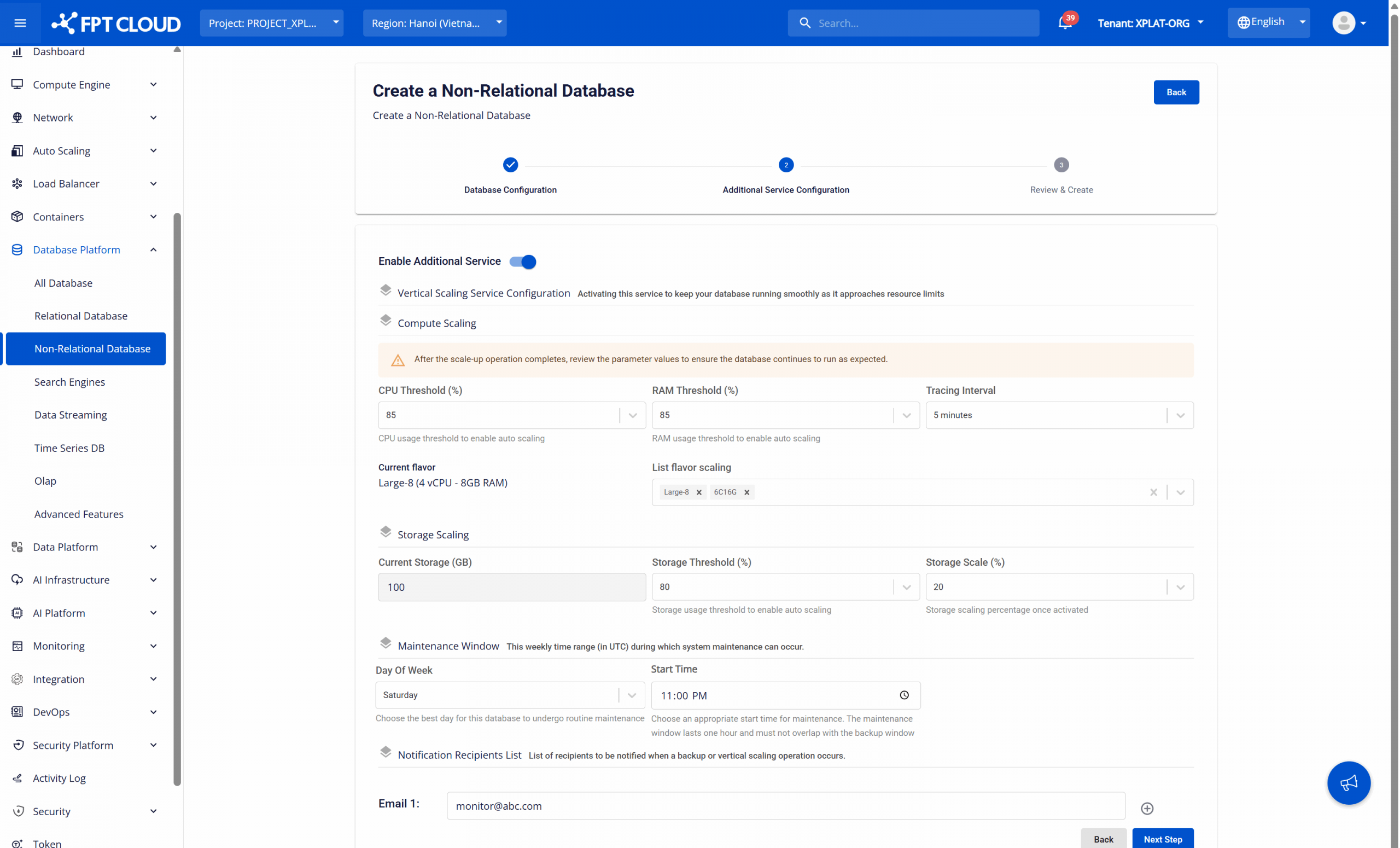 Vertical Scaling Service Configuration: Kích hoạt dịch vụ này cho phép hệ thống tự động mở rộng tài nguyên compute hoặc storage khi vượt ngưỡng sử dụng. Các trường thông tin cần nhập bao gồm: