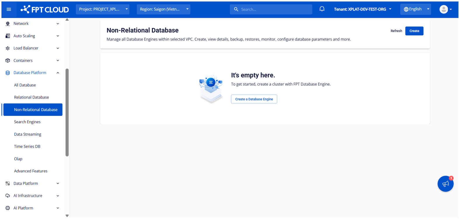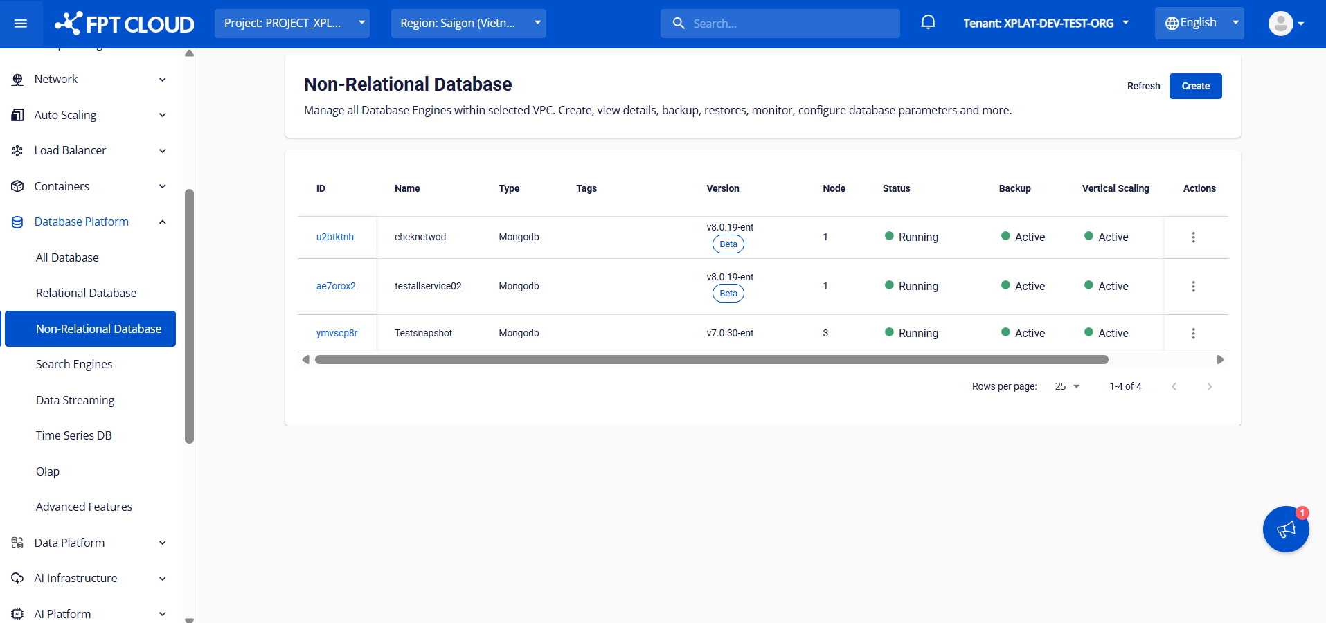 Để truy cập danh sách các cụm cơ sở dữ liệu, người dùng đăng nhập vào FPT Cloud Portal. Từ menu chính, chọn Database Platform > Non-Relational Database. Màn hình Database List sẽ hiển thị danh sách các cụm cơ sở dữ liệu hiện có trong môi trường, kèm theo trạng thái hoạt động và các thông tin chính phục vụ cho việc giám sát và quản lý: