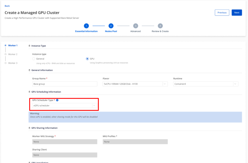 Nếu bạn enable vGPU scheduler trên một worker group, tất cả các sharing mode khác như MIG, MPS, Time slicing cần được disable trên worker group đó.