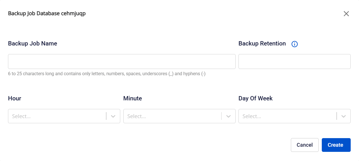 | Hour / Minute / Day of Week | Thiết lập lịch chạy backup (giờ, phút, ngày trong tuần). Lưu ý: Đối với engine Kafka, thao tác backup có thể gây gián đoạn tạm thời. Bạn nên lên lịch chạy backup vào khung thời gian ít tải để hạn chế ảnh hưởng đến dịch vụ. |