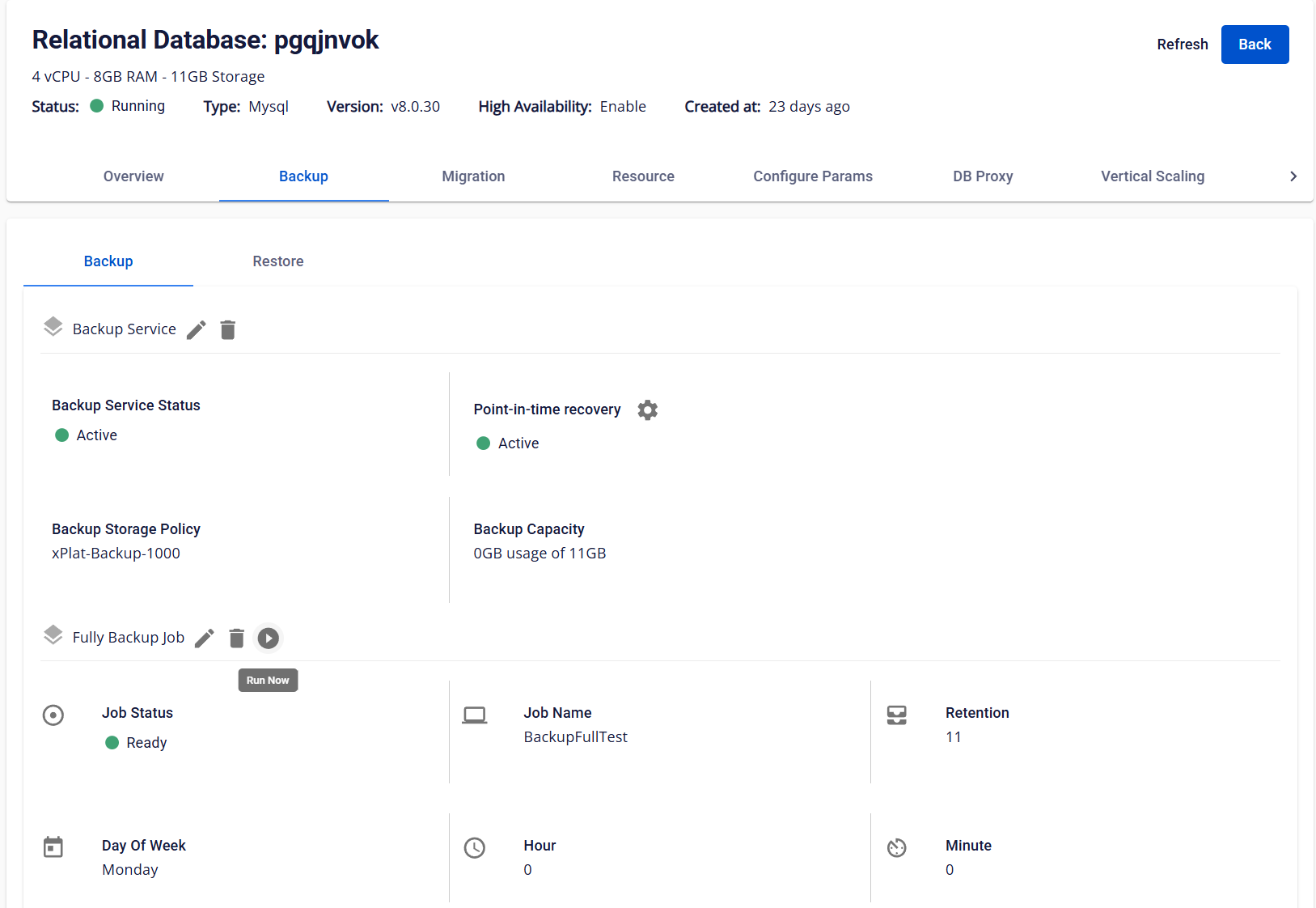 Sau khi điền đầy đủ thông tin, bạn có thể nhấn Create để tạo job sao lưu mới. Quá trình này kéo dài từ 5 - 10 phút và sẽ hiển thị job backup ở trạng thái Creating. Sau khi tạo thành công, job backup hiển thị ở trạng thái Ready với các thông số đã thiết lập cho job và sẵn sàng chạy backup database theo lịch đã thiết lập.