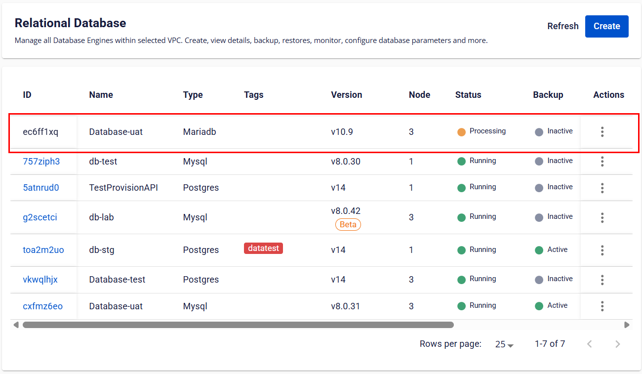 Người dùng sẽ được chuyển về màn hình danh sách, trong đó database vừa tạo sẽ hiển thị ở trạng thái Processing ở đầu danh sách.