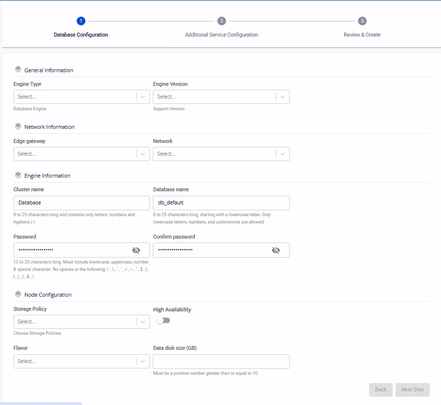 Tại step 1, người dùng cần nhập các thông tin cấu hình cơ bản, bao gồm: loại engine, cấu hình network, thông tin cluster và cấu hình tài nguyên cho database. Tùy theo loại database engine được chọn, một số trường thông tin có thể khác nhau.