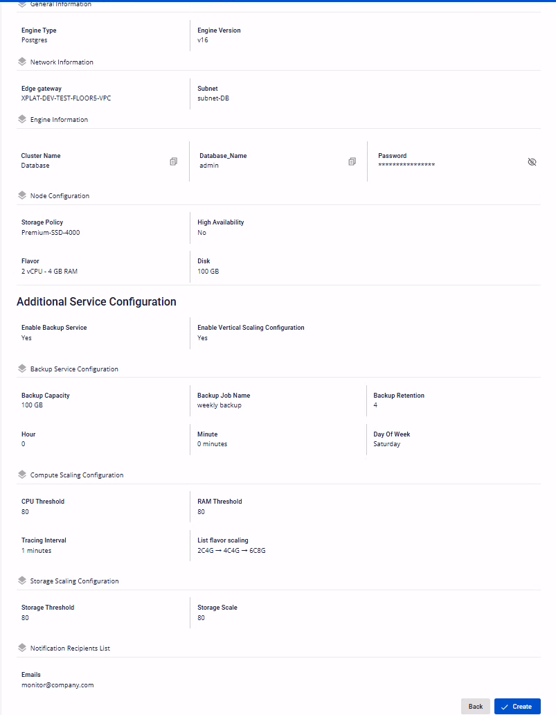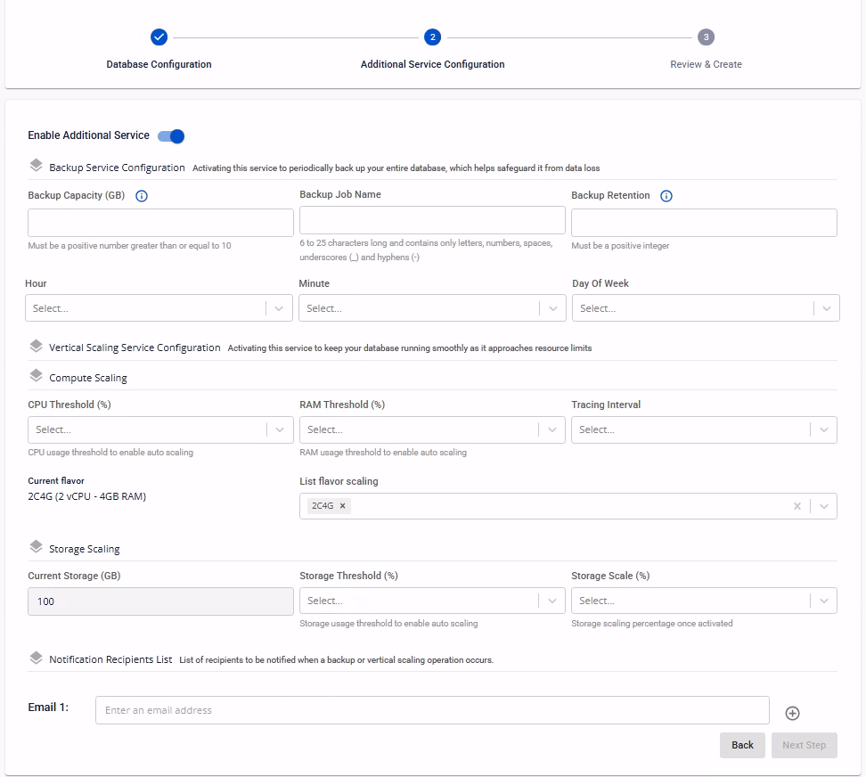 | Notification Recipients List | Nhập danh sách email nhận thông báo khi có sự kiện backup hoặc scaling được thực thi. Có thể nhập nhiều email bằng cách nhấn button + để thêm một email mới vào danh sách. |