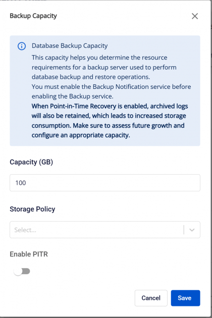 | Capacity (GB) | Nhập dung lượng lưu trữ dữ liệu backup cho database, tính theo đơn vị GB, với giá trị tối thiểu là 10 GB. |