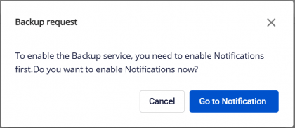 Lưu ý: Điều kiện cần để kích hoạt dịch vụ Backup là phải enable dịch vụ Notification trước. Nếu chưa cấu hình Notification sẽ hiển thị hộp thoại như sau: