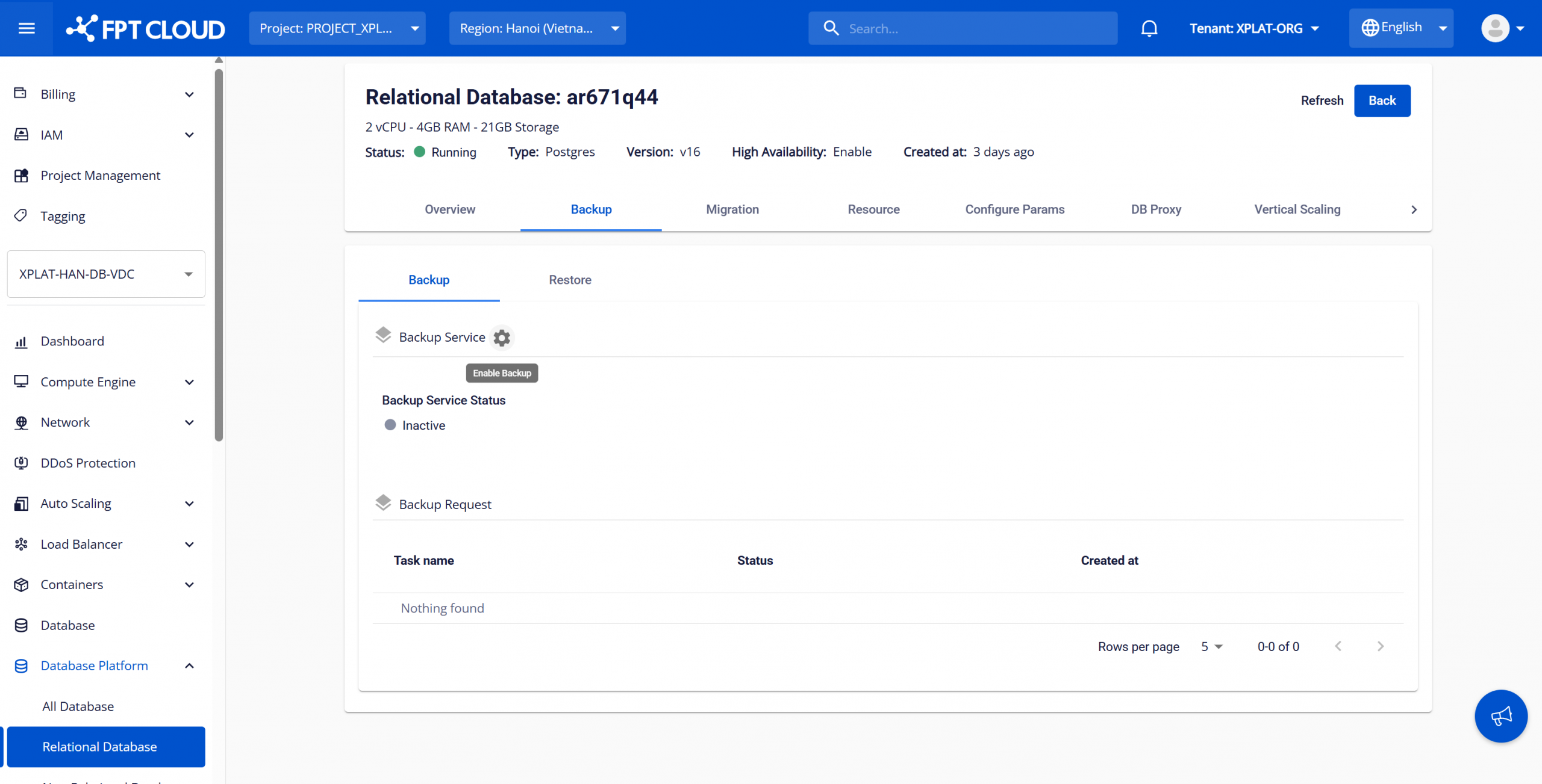 Sau khi cụm Database được tạo và dịch vụ Backup chưa được kích hoạt, trạng thái của dịch vụ sẽ mặc định là Inactive. Người dùng có thể nhấp vào biểu tượng “Enable Backup” (hình răng cưa) để mở hộp thoại và tiến hành kích hoạt dịch vụ. Tùy theo loại database engine và VPC là VMWare hay Open Stack mà một số trường thông tin có thể hiển thị khác nhau.