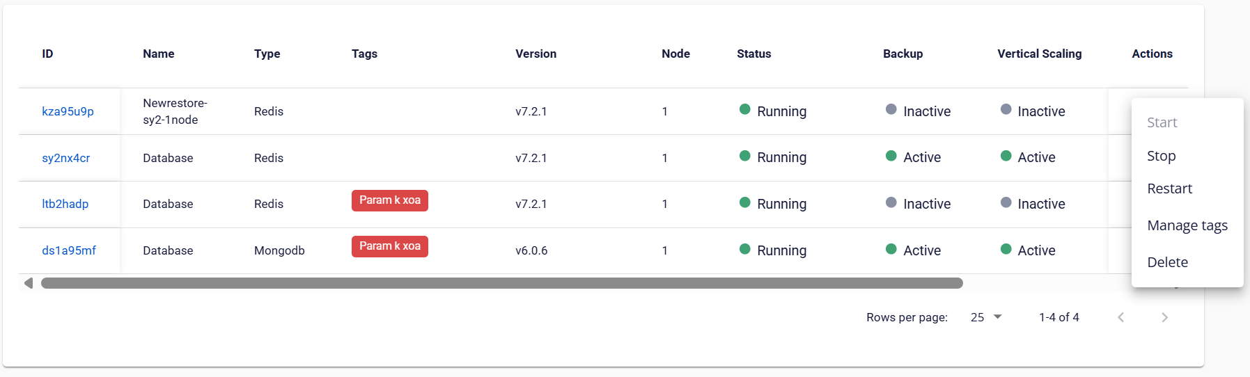 | Running | Cơ sở dữ liệu đang hoạt động bình thường. | Stop, Restart, Delete |