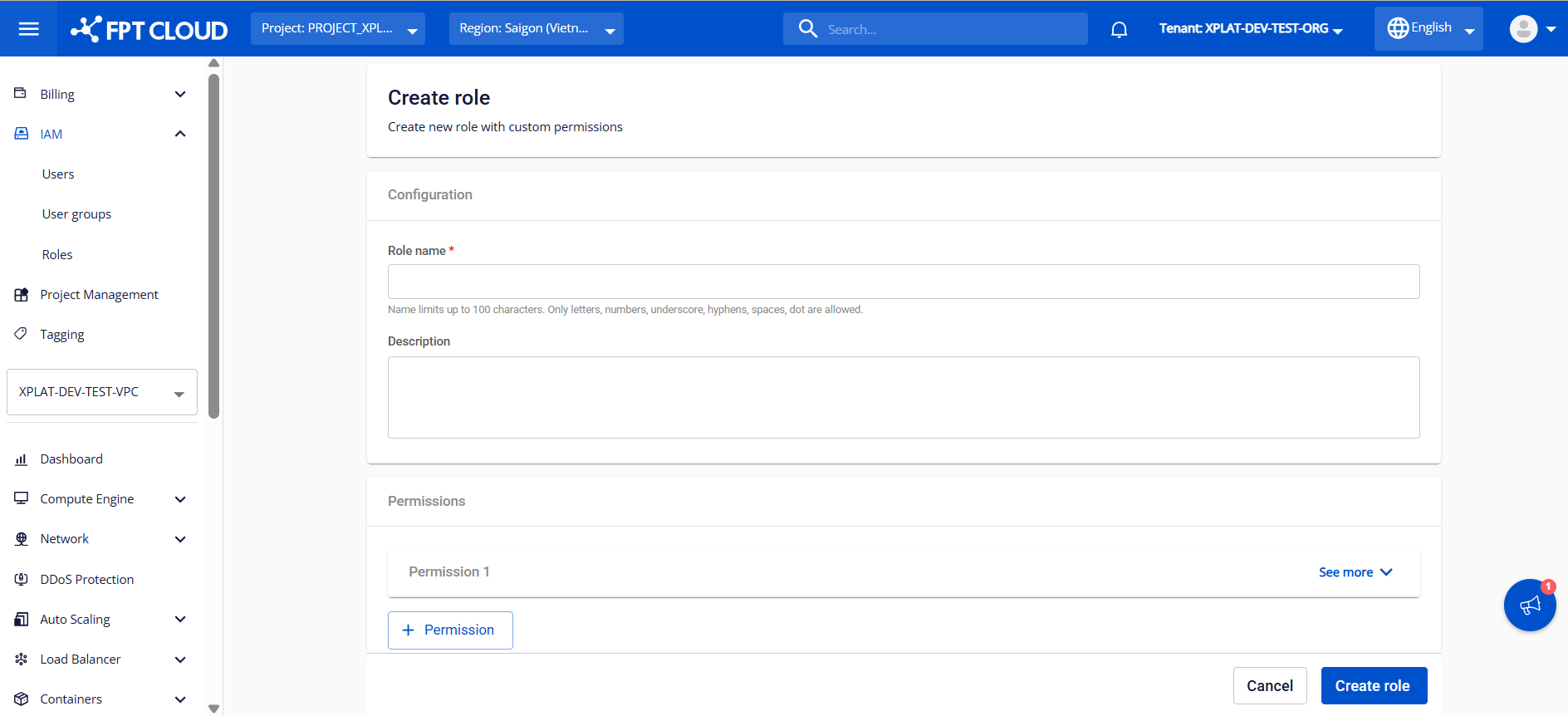 Role là một thành phần cốt lõi của mô-đun IAM trên FPT Cloud Portal. Chức năng Quản lý Role cho phép quản trị hệ thống định nghĩa và gán các vai trò với tập quyền truy cập (permissions) cụ thể cho người dùng khi sử dụng dịch vụ FPT Database Engine.