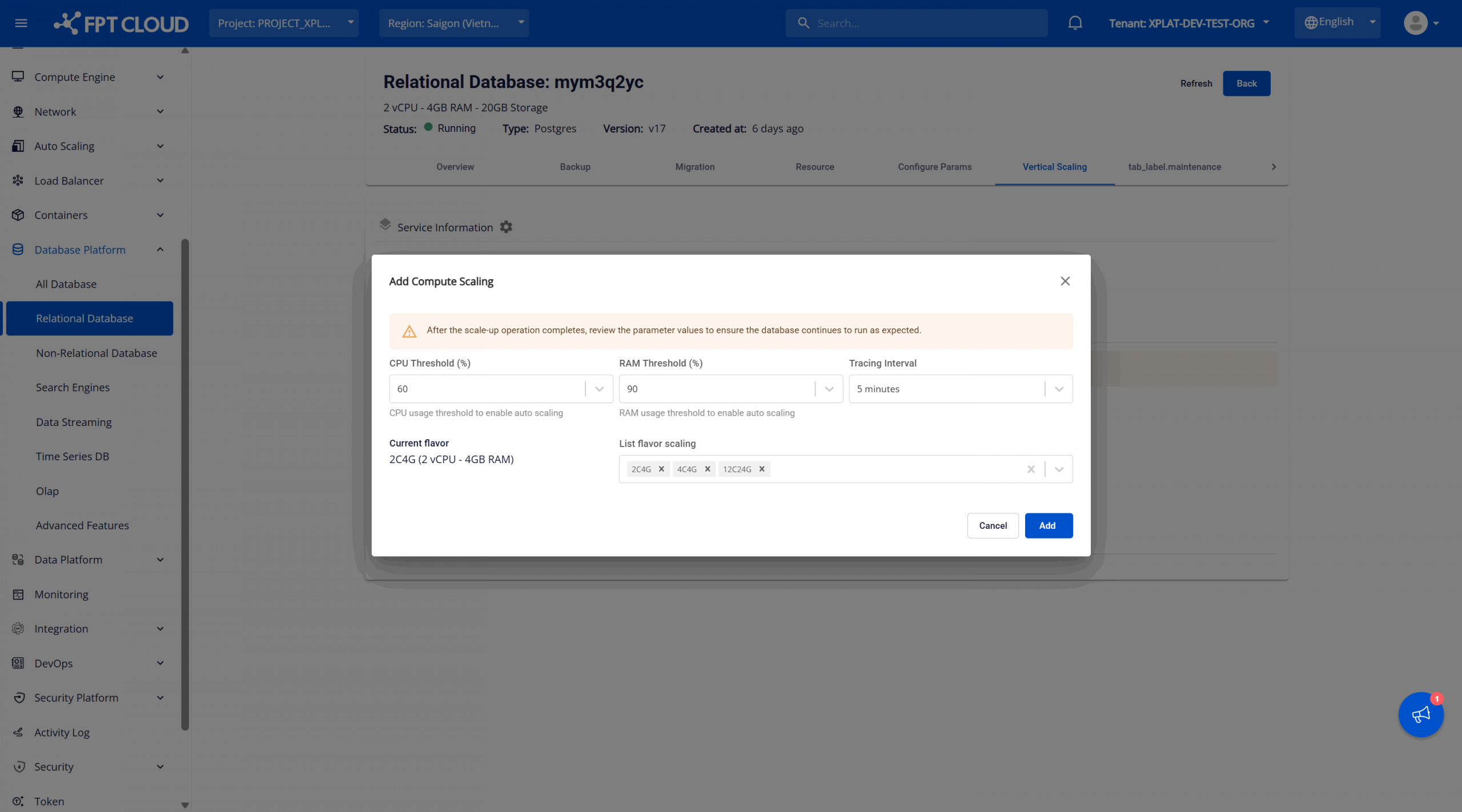 Trên màn hình Vertical Scaling, nhấn Add Flavor Scaling (biểu tượng dấu cộng) trong mục Compute Scaling, hệ thống sẽ hiển thị hộp thoại Add Compute Scaling để cấu hình tự động mở rộng vCPU và RAM cho cơ sở dữ liệu.