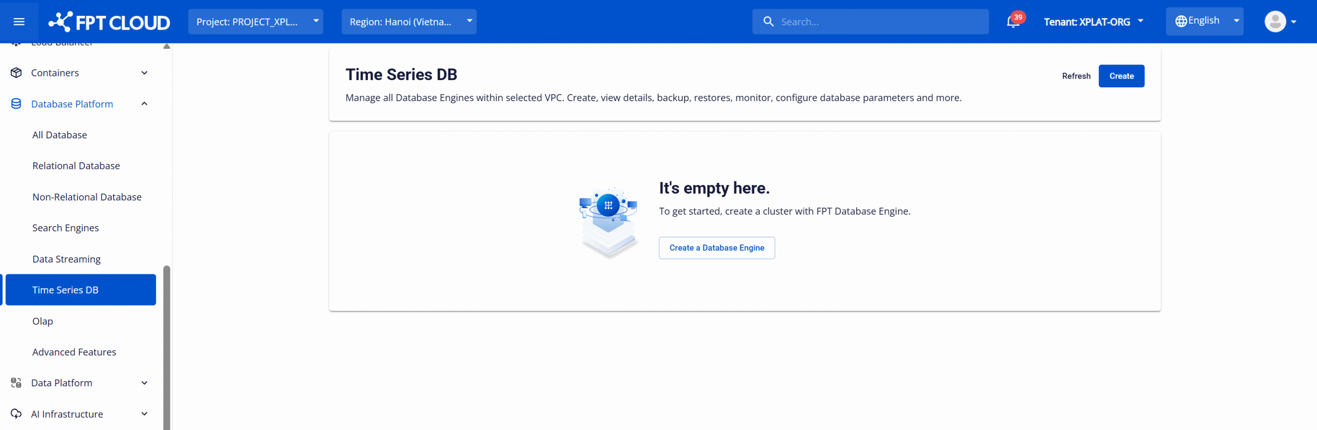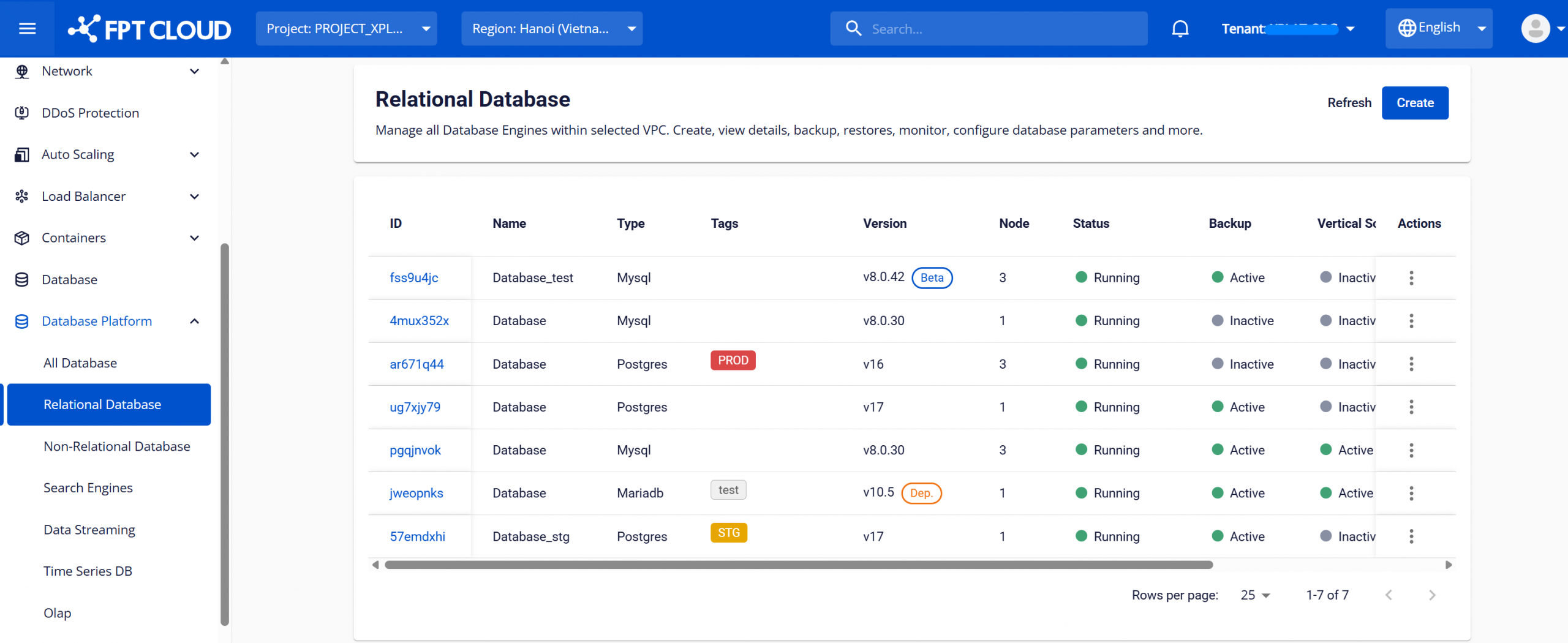 Để truy cập danh sách các cụm cơ sở dữ liệu, người dùng đăng nhập vào FPT Cloud Portal. Từ menu chính, chọn Database Platform > All Databases hoặc lựa chọn menu tương ứng với nhóm cơ sở dữ liệu theo nhu cầu sử dụng, bao gồm: