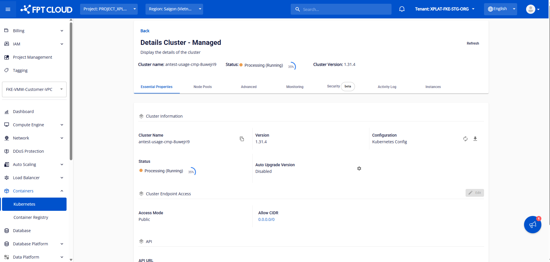 Sau khi điều chỉnh min-max node hệ thống sẽ thực hiện scale-in đúng node đã được chỉ định. Quá trình scale-in sẽ thực hiện trong vòng vài phút, Status của Cluster sẽ chuyển sang Processing. Cluster vẫn hoạt động bình thường.